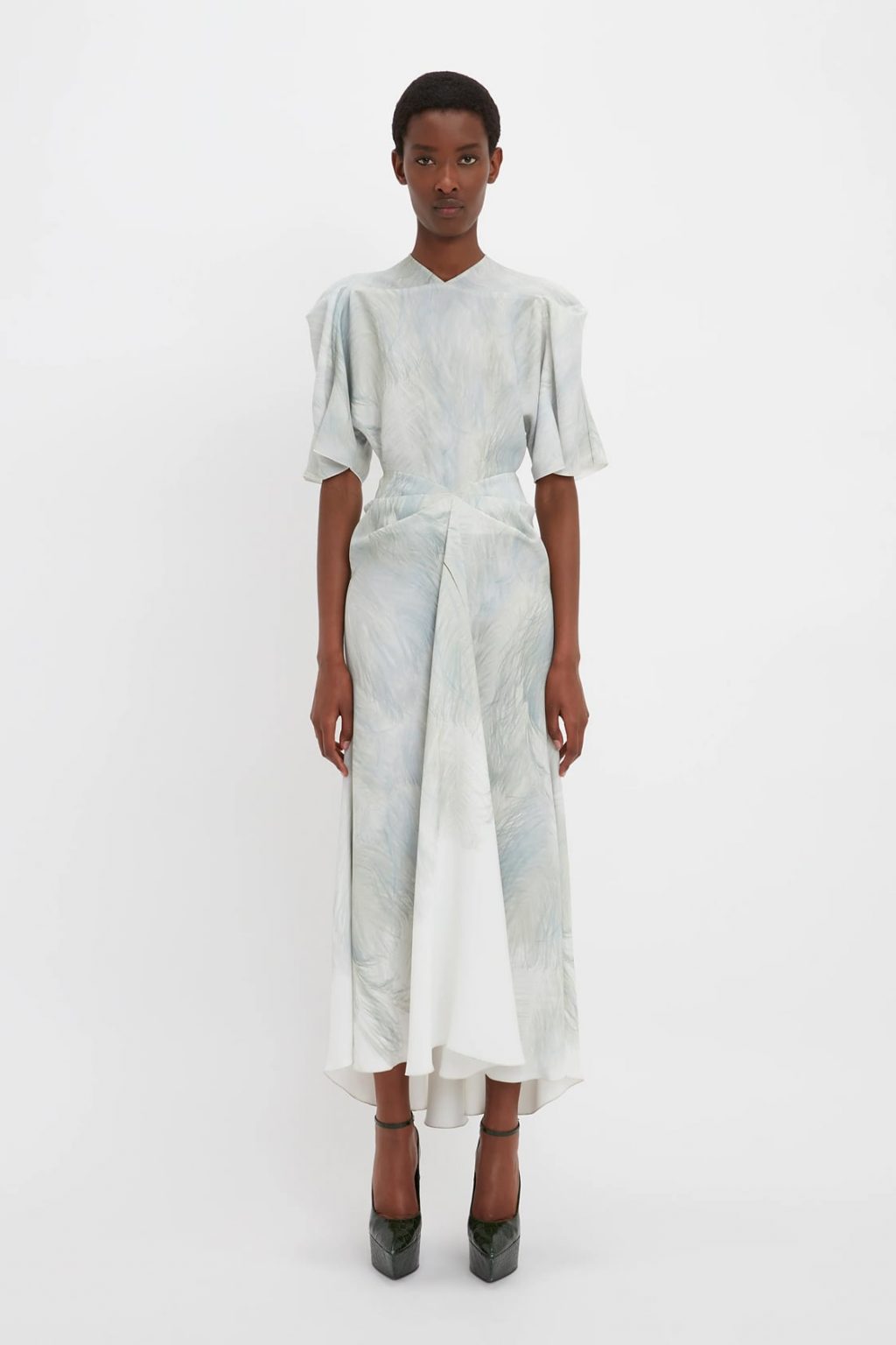 Drape Sleeve Midi Dress In White Digital Feather Print